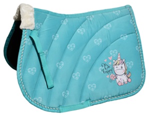 With touch tape fasten girth secure straps and girth placement straps, fur wither pad for comfort Finished with metallic three-tone rope binding and the cutest ‘Be Happy' Unicorn Logo to both sides.