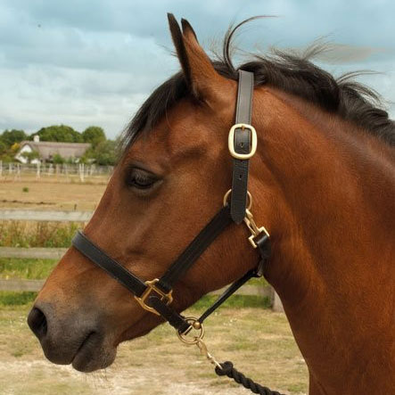 Economy leather headcollar with noseband adjustment and throat latch clip.