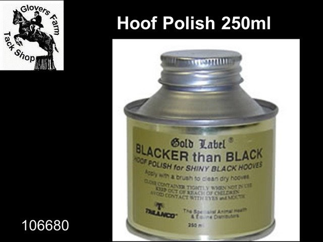 Rapid drying cosmetic black hoof varnish. Apply with the brush provided to clean dry hooves for instant, lasting black shine. Remove with varnish remover and apply a hoof preparation such as hoof oil.