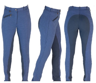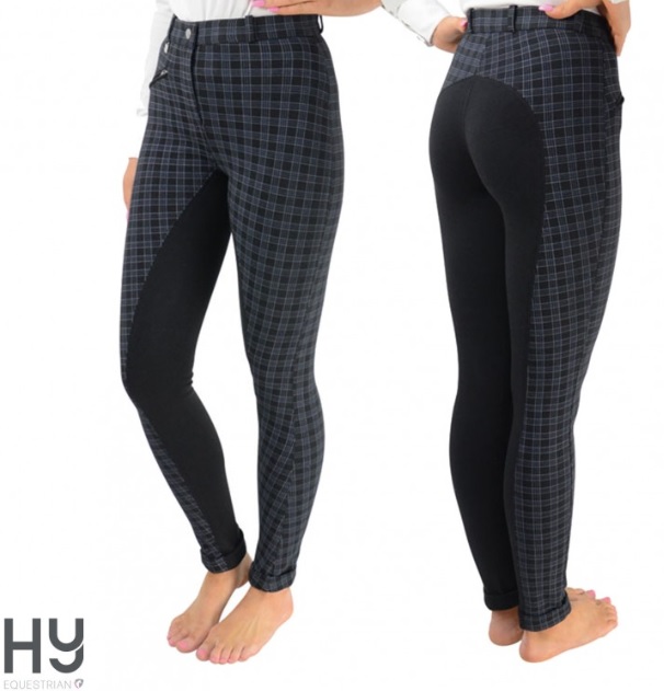 Fashionable two tone check printed knitted jodhpur with plain seat. Classic cut, comfortable and flattering in style. Premium weight 94% Cotton and 6% Spandex for great 4 way stretch and comfort. Featuring discreet front zip pocket, full zip fly, belt loops, reinforced stitching and elastic boot strap at the ankles (removable) with rolled up bottoms. Machine washable at 40°C. Leg length: Regular. Make a fashion statement today! A must have product.