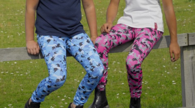 Junior riding tights in a fun pony camouflage print with a silicone full seat and inside leg for grip. Pull on style tights with a stretchy, soft waistband for comfort.