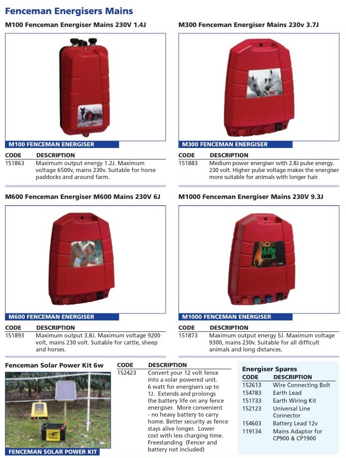 M series mains 230v energisers M100 – Entry level suitable for light general use. 1.2J pulse energy suitable for 12km. M300 – Mid-range energiser for general use. 2.6J pulse energy suitable for up to 20km. M600 – Mid-range energiser for cattle, sheep and horses. 3.8J suitable for up to 25km. M1000 – Mid to top range energiser for livestock. 4.5J suitable for up to 30km. mProtect – High specification smart energiser with 11J pulse energy suitable for 65km with vegetation (475km with no vegetation). Monitors power levels and features an alarmed time delay. All fenceman mains energisers carry a three year warranty and feature built in lightning protection.