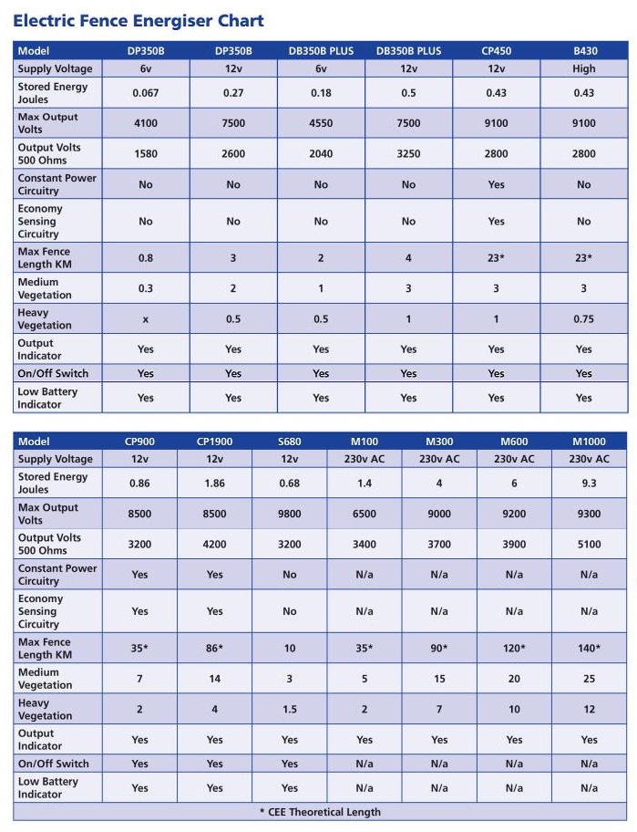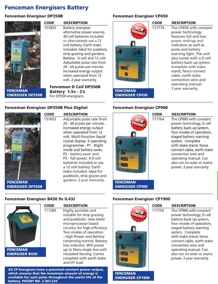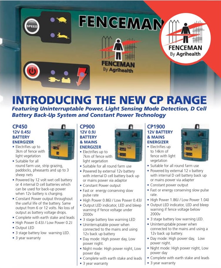 Featuring uninterruptable power, light sensing mode detection, D cell battery back-up system and constant power technology. CP900 & CP900: Mains or battery powered. (Mains adaptor purchased separately). Adjustable pulse power settings. Powered by 12v with internal D cell back-up. Audible beep when battery low. Solar ready. CP900 - (1.86-1.04J). Powers up to 14km. CP900 - (0.86-0.43J). Powers up to 7km. CP450: Battery powered and featuring full and low power settings (0.43-0.2J). Powered by 12v with internal D cell back-up. Powers up to 3km. Comes with stake stand, fence connect cable and earth stake connection wire.